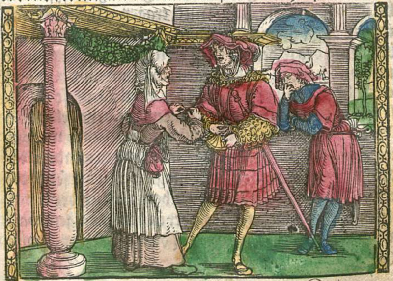 The decision to include Celestina in this illustration is odd, seeing as neither she (nor any other female character) is included in the second act. However, the illustration likely represents the end of the first act, in which Calisto gives her 100 gold crowns as pre-payment for her services. We see that Calisto (central figure) is holding a small bag, and Celestina (leftmost figure) has something in her hands. Behind Calisto, we see another male figure (either Sempronio or Pármeno), who appears to be yawning.