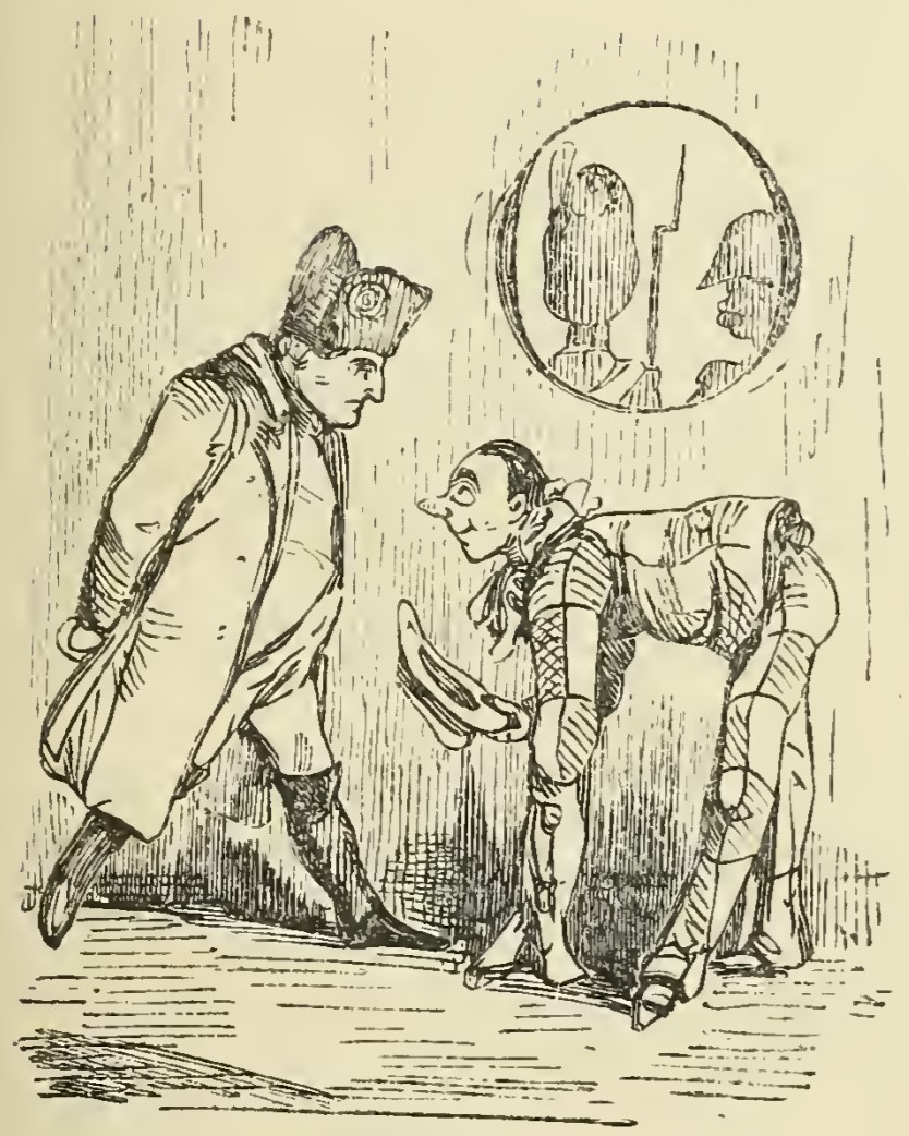 A jester in a checkered suit with a large ruff, holding his hat in his hand, bows deeply to a man in military uniform. A window, through which the heads of two soldiers can be seen, forms the letter O from Our.