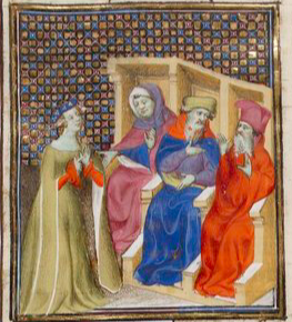 Hortensia bravely fought for the Roman women in front of the Triumvirate. She wanted to relieve them of their heavy taxes that men did not need to pay. She is seen in the green gown, standing before the Triumvirate who are seated in chairs.