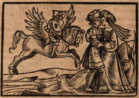 Medusa is illustrated on the right side of the engraving embracing the god Neptune. Medusa is depicted in her human form in this engraving before having been turned into a monster by Minerva. Boccaccio explains that Minerva transforms Medusa into a monster because she was angry that she had sexual relations with Neptune inside one of her temples. Boccaccio also explains that Medusa ends up giving birth to a Pegasus, which is engraved behind Medusa on the right side of the engraving. The hero Perseus is depicted riding his Pegasus on the left side of the engraving as he is on his way to conquer Medusa’s kingdom.