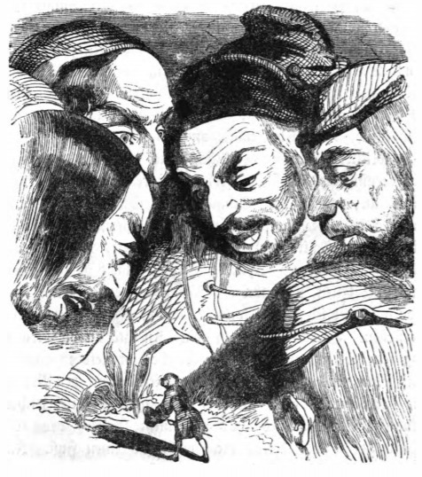 In this image we see a group of giants crowding around to get a look at Gulliver. Most of the faces of the giants are obscured in some way to show that they are huddling close together. Gulliver stands in the centre of the ring of giants. Gulliver leans forward towards the giant on the far left as though he is speaking to one of the giants with his hat in his hand. This giant is likely the farmer who found him as he is not wearing a hat, just as he was shown in other images. All the other giants wear some form of cap. The same image appears in the 1839 Krabbe edition.