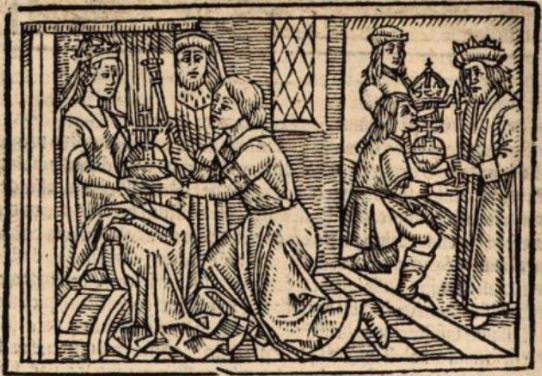 The left side of the engraving depicts Empress Irene of the Eastern Roman Empire sitting on her throne. There is a man kneeling in front of her presenting her with the globus cruciger to demonstrate her authority. The right side of the image depicts the pope crowning Charlemagne as emperor. The pope did not recognize Irene’s rule as she was a woman, which led him to coronate Charlemagne as emperor. He is presenting Charlemagne with a crown as well as the globus cruciger.