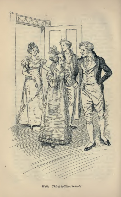 In this image we see Miss Bates walking into the ballroom at the Crown Inn on Mr. Weston’s arm. Behind them we see Emma and Frank Churchill. The Westons gave a ball in Frank’s honour during his visit to Highbury. Miss Bates was thrilled with the sight of the room as it was finely cleaned and decorated. This scene occurs in chapter 38. The characters are shown in the traditional regency style. Miss Bates and Emma wear the regency style dress with empire waistlines. Miss Bates has feathers in her hair and Emma holds a fan. Mr. Weston and Frank Churchill wear waistcoats and tailcoats with breeches and cravats. The regency period dated to the early nineteenth century (1811-1820) when George, Prince of Wales, later George IV (r. 1820-1830), reigned as regent for his mentally ill father, King George III (r. 1760-1820). The regency period is associated with the rise of neoclassicism in art and fashion.