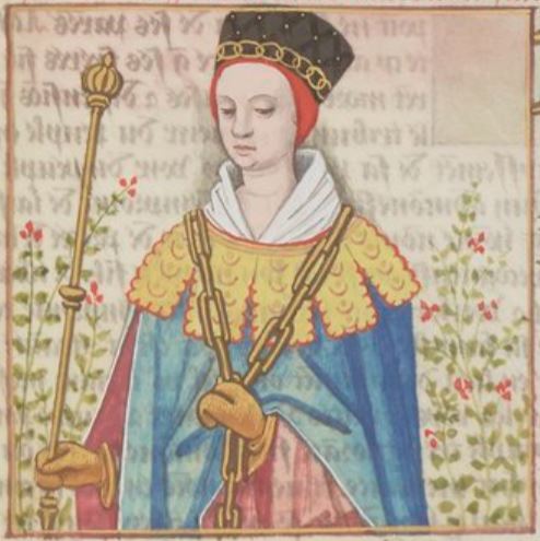 This illumination depicts a portrait of Dripetrua, the daughter of King Mithridates of Pontus. She is depicted in royal garb while holding a scepter in her right hand. Boccaccio explains that she was born with two sets of teeth and was incredibly hideous, however, she was also very devoted to her father, which deserved praise.