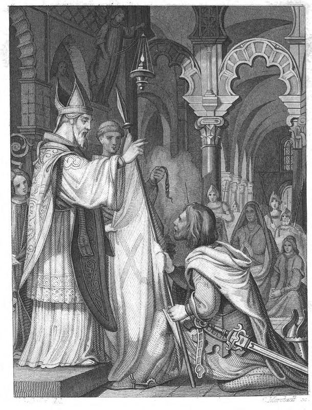 Don Rodrigo kneels in front of a bishop holding a flag bearing a red cross. His wife and daughters, Elvira and Sol, look on.