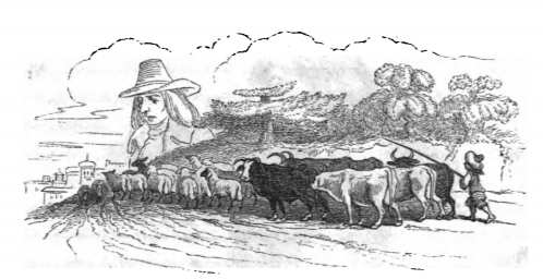 Here we see a flock of Lilliputian cattle walking towards the town. The cattle is attended by a Lilliputian man. Gulliver’s head and shoulders are visible over the hill where he watches the cattle. The image comes when the Emperor gives Gulliver his own household and staff, with the cattle making up a part of Gulliver’s household farm. The same image appears in the 1843 Krabbe edition.