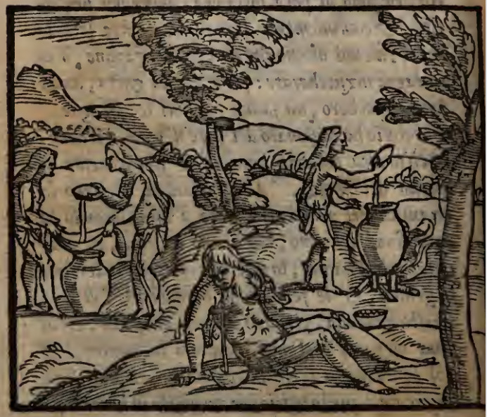 Four Indigenous women prepare an alcoholic beverage. The woman in the middle sits on the ground while she chews on the corn or grain used to make the alcohol and spits it into a bowl beside her. Two women on the left strain the saliva mixture into a large pot using a cloth. On the right, another woman pours the strained liquid into a pot over a fire to boil.