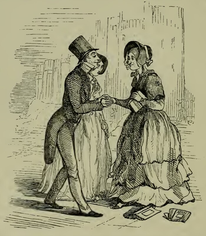 Mr. Pitt Crawley introduces Miss Briggs, his aunt’s companion, to Lady Jane Sheepshanks, his betrothed, with a smug look on his face. Miss Briggs, on her way home from the library, is holding one of her books and has dropped two others. Lady Jane is half hidden behind Mr. Crawley, looking shy.