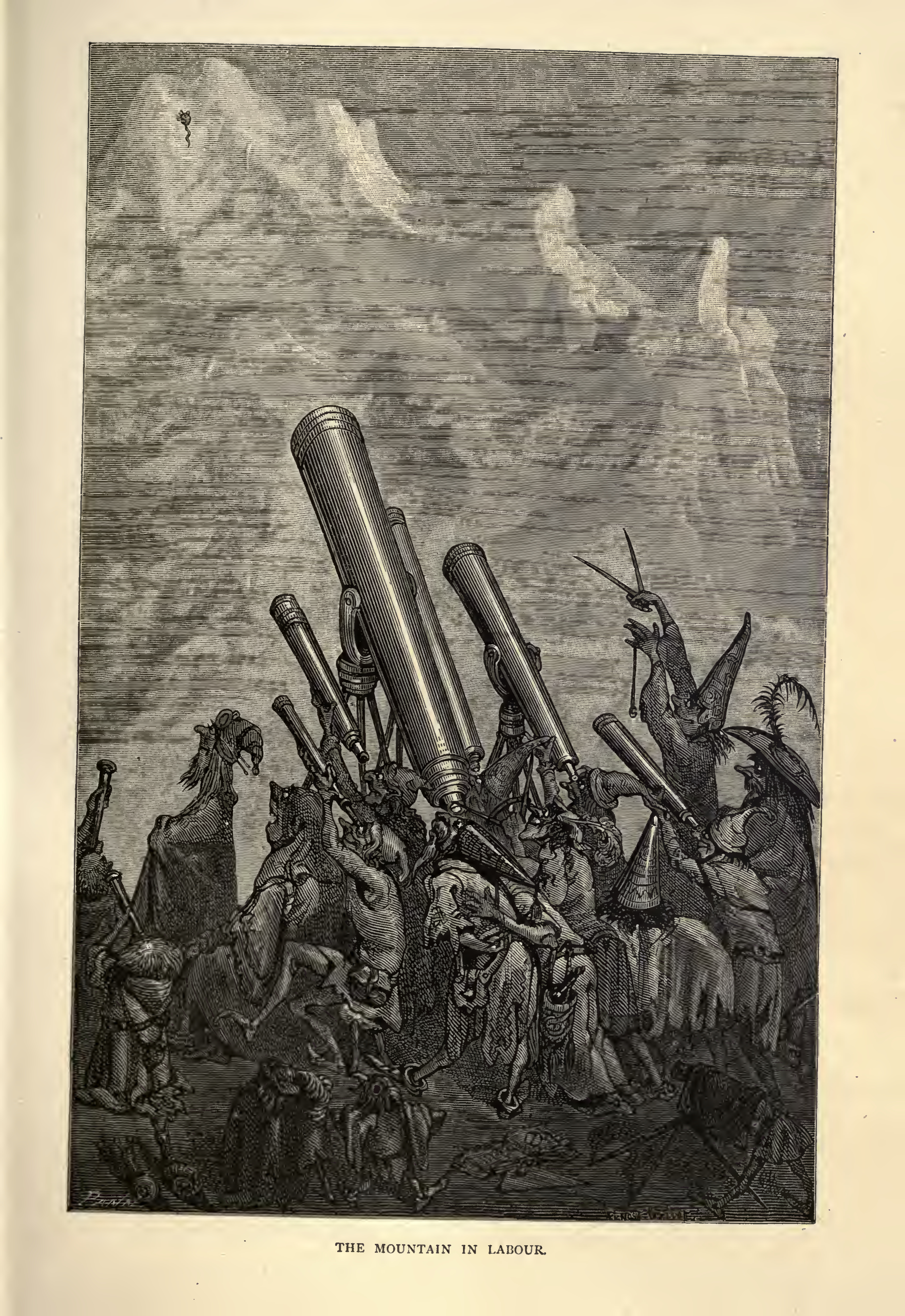 A group of people are gathered around; all wear pointy hats of hats decorated with feathers atop their heads. Many are holding telescopes. Some holding them by themselves, while others look through the telescope as a group of people hold it in place on their backs. All are looking up at the top of a mountain where a small ball with a little tail is flowing up.