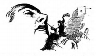 [a Lilliputian tickles Gulliver’s nose with his sword]