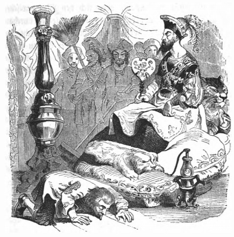 [Gulliver licks the dust in front of the King of Luggnag]