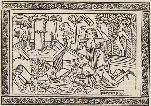This engraving depicts Thisbe, a young virgin from Babylon killing herself after finding her lover, Pyramus, already dead. Boccaccio explains that the two lovers were forbidden from being together, so they devised a plan to run away. Thisbe waited for Pyramus by the fountain depicted on the left-hand side of the engraving, when a lioness appeared. Thisbe ran into the woods, as depicted in the background on the right side of the image. The lioness, with a bloodied mouth, chewed on the cloak that Thisbe left behind after running. This is illustrated in the foreground of the engraving. Pyramus had then arrived at the meeting point, only to find the bloody cloak of Thisbe. Believing her to be dead, Pyramus killed himself with his sword. Pyramus is depicted in the foreground of the engraving, lying on the ground with his sword impaled into his chest. The creator engraved his name beside his leg to identify him. Thisbe found Pyramus as he was dying and impaled herself with the same sword in order to be with her lover. Her name is engraved just below her left arm.
