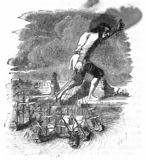 In this image we see Gulliver pulling Blefuscudian ships back to the port in Blefuscu. Gulliver threw ropes and hooked the ships. Gulliver then used the ropes to pull the ships back to their home port, resulting in damage to the ships. In the image we see Gulliver stepping out of the water onto land with his left arm stretched above his head. In his right hand he holds fifteen ropes attached to ships – not all of which are visible. On the right hand side several Blefuscudians are visible, looking onto the scene. The same image appears in the 1839 Krabbe edition.