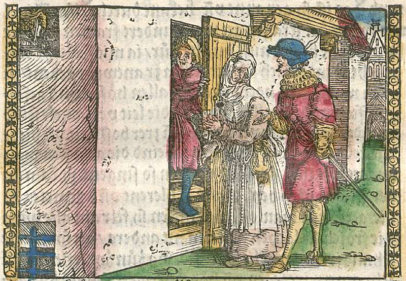 Sempronio (rightmost figure) is shown arriving at Celestina’s house to request her aid on behalf of Calisto, and he encounters Celestina (central figure) in the street. In this illustration, she is shown opening her door. Inside, we see Crito (leftmost figure) descending the staircase. Celestina and Elicia attempt to hide him from Sempronio.The entire illustration is identical to the one found on page 95 of the text (folio f1r): [Act V – Pármeno Opening the Door for Celestina and Sempronio].
