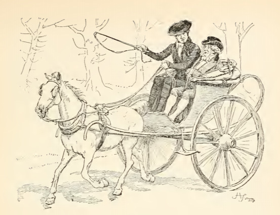 In this image Sir William Lucas leaves Charlotte and Mr. Collins in Hunsford. Sir William went to visit his daughter and son-in-law after their marriage. He only stayed a week and after being convinced that Charlotte was settled comfortably, he returned to Meryton. This scene occurs in chapter 30. The characters are shown in the traditional regency style. Sir William and the driver wear waistcoats and tailcoats. The regency period dated to the early nineteenth century (1811-1820) when George, Prince of Wales, later George IV (r. 1820-1830), reigned as regent for his mentally ill father, King George III (r. 1760-1820). The regency period is associated with the rise of neoclassicism in art and fashion.
