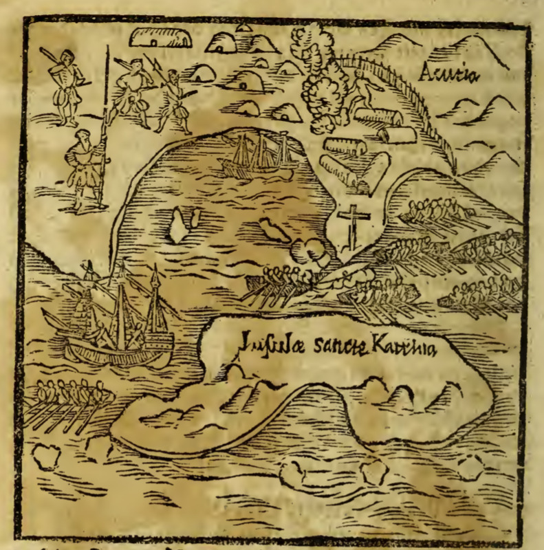 Two larger European ships are shown near the coast, as well as seven smaller rowboats filled with colonists. At the tip of the bay there is a large cross. Near the shore is an Indigenous village labelled ‘Acutia’, with several long structures, a fence, and several mounded structures. One Indigenous person stands in the village. Four colonists armed with spears and rifles approach the village from the left.