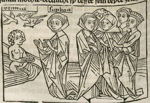 This engraving depicts Sulpicia, a woman renown for her chastity, consecrating a statue of Venus. Sulpicia is depicted on the left side of the engraving with her hands reaching out towards the nude statue of Venus. We know that these figures are Sulpicia and Venus as their names are engraved above their heads. There are doves flying above the statue of Venus as dove’s are known to be one of many symbols of the goddess. There is a group of women depicted behind Sulpicia as they were all chosen as some of the most chaste women of their time, and they all voted for Sulpicia to be the one to consecrate the statue.