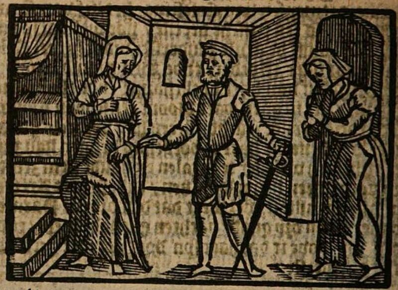 Elicia goes to Areusa’s house to inform her about the deaths of Celestina, Sempronio, and Pármeno. As she approaches the door, she overhears Areusa in a fit of rage. She realizes that Areusa is yelling at someone (Centurio) and waits for him to leave before entering. Areusa sees that Elicia is in mourning and asks her to explain why, and Elicia tells her about the deaths. With a desire to avenge the deaths that were caused as a result of Calisto's love for Melibea, they decide to ask Centurio to kill Calisto.In this illustration, we see Centurio reaching out toward Areusa, who appears to be pulling away from him. She is wearing a robe and a veil, while he is wearing a hat. In his left hand he is holding a sword, the tip of which is resting on the ground. To the right we see Elicia awaiting the departure of Centurio (in the narrative she waits outside the house). She is wearing a robe and a veil, and her posture and expression convey an air of sadness.The entire image is identical to those found on pages 200 and 246 of the text.