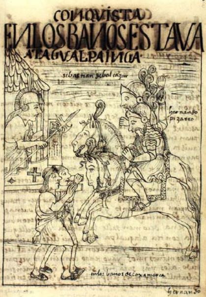 This chapter focuses on discussing the arrival of Spaniards and the Spanish conquest of Peru. This image depicts two conquistadors on the right side of the image, labeled as Sebastian de Benalcazar and Hernando Pizarro. They are illustrated galloping on their horses towards the Inca Emperor, Atawalpa Inca, who is depicted sitting on his royal litter on the left side of the image. The Spaniards and their horses are suited in their armour prepared to fight the emperor to begin their conquest of the empire. Atawalpa Inca and the two men carrying the litter have frightened expressions as they had never seen horses being ridden before. The caption at the bottom of the image identifies the location of this scene. The caption reads, en los banos de caxamarca [at the baths of Cajamarca].