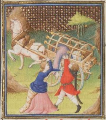 This illumination depicts a woman named Claudia, who was a vestal virgin in Rome. She is depicted grabbing onto a man wearing a red shirt and hitting him. Her father was a noble man who, under the order of the senate, rode through a populous area of Rome on a chariot as he showed off his triumph. A man had run up to Claudia’s father in a rage and was about to attack him, but not before Claudia put herself in front of the man to protect her father. The man in the red shirt is illustrated grabbing on to Claudia’s father and attempting to drag him out of the chariot while Claudia hits the plebeian. Boccaccio explains Claudia is praiseworthy due to her devotion to her father and for her actions of risking her life for him.