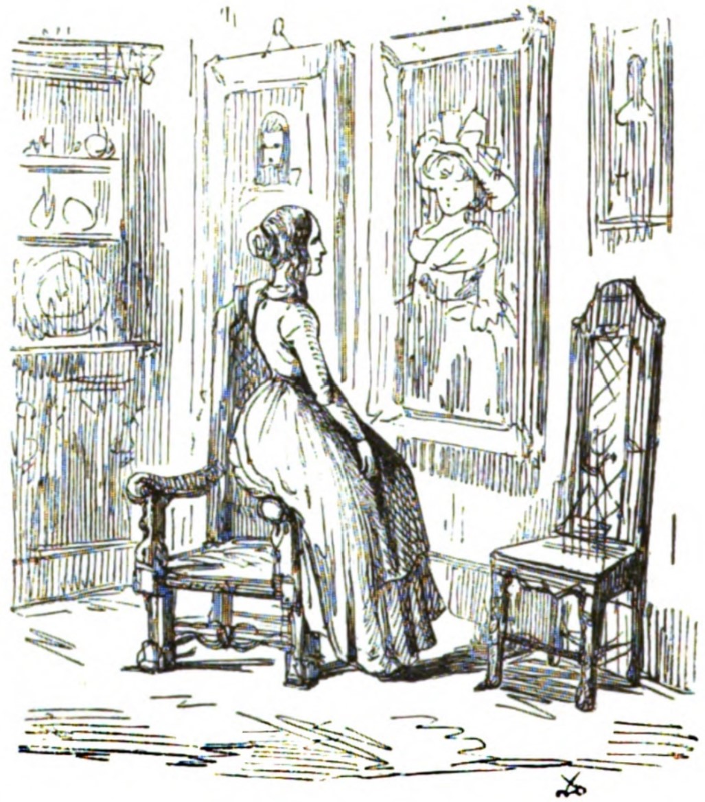 Rebecca Sharp is seated on the arm of a chair in the great hall at Queen’s Crawley, looking at a large painting of a woman. It is hung on the wall between paintings of other Crawley ancestors. To the left is a cabinet, and to the right is a high-backed armless chair.