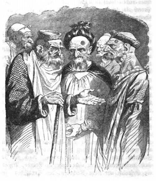 A diplomat from Luggnag explains the reality of the immortals to Gulliver. He says that they act like mortals until about the age of thirty, and then become very melancholy until about eighty years old. At this time, they recon themselves with the reality of never dying. The diplomat also says that the immortals often become opinionative, peevish, morose, vain, covetous, talkative, and incapable of friendship. Furthermore, they lose all ability for affection, even for their descendants. Their primary characteristics become impotent desires and envy. They cannot experience pleasure, and when they attend a funeral, they find themselves envious of others who could die. Their memories also begin to fade. In this image we see a group of these immortal men looking angry and discontent. They are identified by the large spot on their forehead above their left eyebrow. The same image appears in the 1843 Krabbe edition.