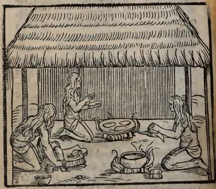 Three Indigenous women make bread inside a shelter comprised of a thatched roof and one wall. The woman on the right grinds corn and cooks it over a fire, the woman on the left rolls dough, and the woman in the middle grills the bread on a flat surface over a fire.