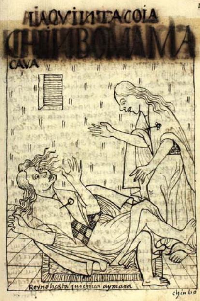 This illustration depicts Mama Caua, the fifth Coya [Queen] of the Inca Empire. She was married to the Inca king, Capac Yupanqui. The author explains that this queen suffered from heart issues which caused her pain. In this image, she appears to be in pain, which could be from her heart condition. There is another woman in the image who appears to be running to help the queen. The words Reyno hasta Quichiua Aymara are written at the bottom of the image which translates to He reigned to Quechua, Aymara. Quechua and Aymara are two indigenous languages of Peru and Bolivia.