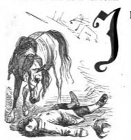 At the general council of the Houyhnhnms it was decided that Gulliver could no longer live with the Houyhnhnms. Gulliver must either live with the Yahoos or leave the Country. When Gulliver heard this news he fainted, seen here. This image appears at the beginning of chapter nine, and the letter I is in the top right corner as it is the first word of the chapter.