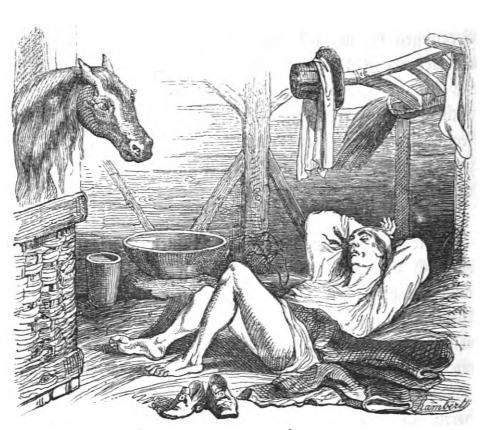 The Houyhnhnms were astonished that the only skin visible on Gulliver was on his hands and face, as the yahoos were completely naked. This served as a distinction between Gulliver and the other yahoos. It was Gulliver’s custom to undress at night and cover himself with his clothes. His master’s valet walked in on Gulliver while he was sleeping, and his clothes had fallen off and discovered that Gulliver’s body was the same as the yahoos. His master was astonished by this, and Gulliver explained how clothing worked. Gulliver asked him to keep this information to himself. The same image appears in the 1839 Krabbe edition.