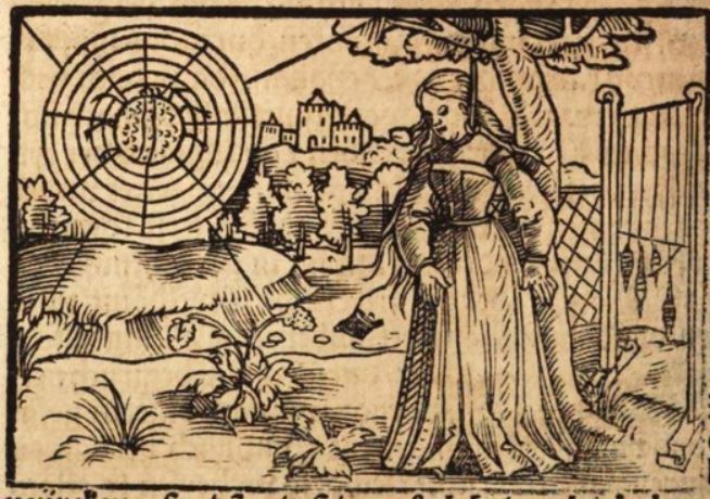 This engraving depicts a woman named Arachne hanging herself. There is a loom on the right side of the engraving and a net to the left of the loom. Boccaccio explains in his story that Arachne is known by ancient writers as being the one who discovered the uses of woven wool and the first to make nets. Arachne became too confident in her wool work and challenged Minerva to a weaving competition. After the goddess had won, Arachne hung herself, as depicted in the engraving. There is a spider on a spider-web on the left side of the engraving, as Arachne is said to have been transformed into a spider after this event.