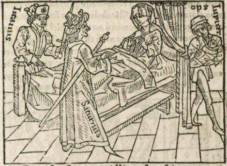 Ops, wife of the god Saturn, is depicted laying in a bed after just having given birth to her children, Jupiter, Neptune and Pluto. We know the woman lying in the bed is Ops as her name is engraved directly beside the bed, in the top right-hand corner. Jupiter, as a baby, is illustrated being carried away. His name is engraved just above the person carrying him. Boccaccio’s story explains that Saturn and Ops’ brother, Titan, planned to kill the children to avoid them growing up and defeating them. Saturn is illustrated with his hands outstretched towards baby Jupiter. His name is engraved on his leg. Titan is on the opposite side of Ops’ bed, similarly with his arm stretching out, facing Jupiter. His name is engraved horizontal to his body.