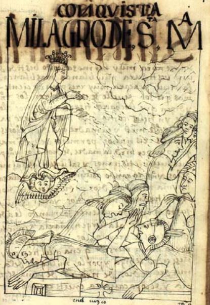This chapter focuses on discussing the arrival of Spaniards and the Spanish conquest of Peru. This image depicts the Virgin Mary appearing before the indigenous people of Peru in Cusco. The people of the Inca Empire had just attempted to burn down a temple that the Christians had stolen from them, and when it would not burn down, it was taken as a sign that the church was now established in Cusco. The apparition of the Virgin Mary was another miracle presented by God. She showed mercy to the Christian Spaniards and threw dirt into the eyes of the indigenous Peruvians for attempting to burn down the church. She is illustrated floating in the clouds in the image as she throws the dirt into the eyes of the struggling indigenous soldiers on the ground. From then on, the Virgin Mary was honoured and adored by not only the Spaniards, but the indigenous people of Cusco as well. The caption at the bottom of the image reads, en el cuzco [In Cusco].