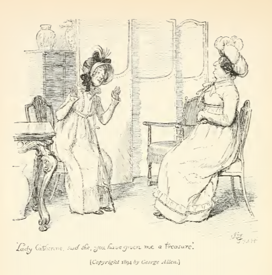 In this image Lady Catherine de Bourgh relates that Lady Metcalfe had called upon her the day before to Mr. Collins, Charlotte, and Lizzy. Lady Catherine had helped Lady Metcalfe’s niece find a husband, and Lady Metcalfe had called to express her gratitude. At this time, finding a good match was crucial and informed a young girl’s livelihood and financial security for the rest of her life. This scene occurs in chapter 29. The characters are shown in the traditional regency style. Lady Catherine and Lady Metcalfe wear regency style dresses with empire waists and bonnets. Lady Metcalfe has a walking stick leaning against her knee as she rises in exclamation of her thanks. The regency period dated to the early nineteenth century (1811-1820) when George, Prince of Wales, later George IV (r. 1820-1830), reigned as regent for his mentally ill father, King George III (r. 1760-1820). The regency period is associated with the rise of neoclassicism in art and fashion.