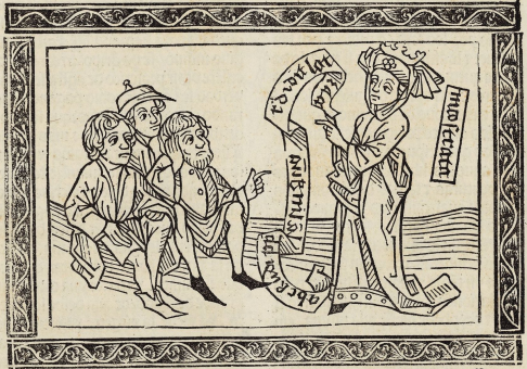 This engraving depicts Nicostrata, a woman who was a famous prophetess during her time, holding a scroll of parchment. We know that this is Nicostrata as the creator engraved her name horizontally adjecent to her body. Nicostrata had gone with her son, Evander, to Italy and he founded the city of Pallantium. Boccaccio explains that once Nicostrata realized that the inhabitants of this city were not well educated or literate, she decided to give them their own language with their own letters and symbols. This was the Latin language. Nicostrata taught the new letters and language to the people of Pallantium, which is what the engraving depicts. There are people sitting on the ground who are listening intently to the prophetess, as she is holding the parchment and pointing at the letters.