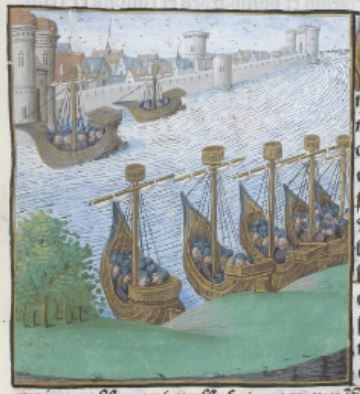 This image appears in the chapter that treats the widow named Camiola. The image depicts a fleet of ships which were the fleet of King Peter II of Sicily. The fleet was to bring aid to the city of Lipari which was under siege. During this siege, a man named Roland of Sicily was captured and Camiola paid for his ransom in exchange for his hand in marriage. When he was freed, he lied and said that he never agreed to marry Camiola. She presented her case to a judge and won against Roland.