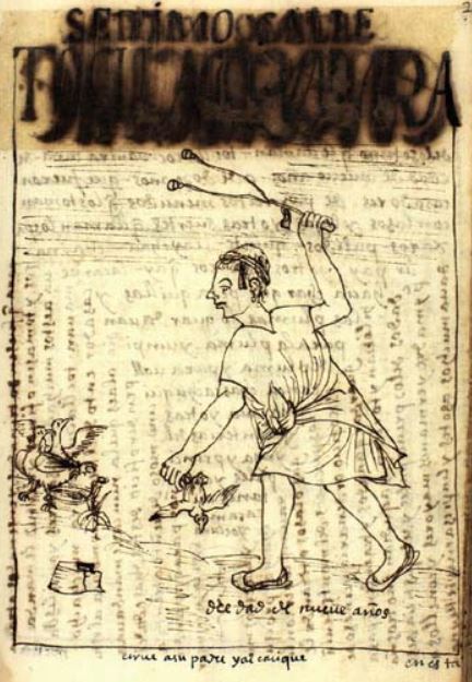 The author explains that there were ten paths for men to follow in the Inca Empire based on age division. This seventh group was called tocllacoc uamra [hunter boys]. These boys were aged from nine to twelve years old and their duties included hunting small birds to use their meat and use their feathers to decorate weapons. The caption at the bottom of the image reads de edad de nueue años cirue a su padre y al cacique which translates to nine years old, he serves his father and the chief. The boy in the image is depicted running towards a flock of small birds with a stick in one hand and a dead bird in his other hand.