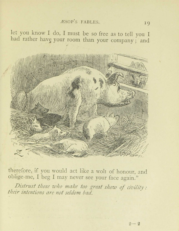 - A Sow had just farrowed, and lay in the sty, with her whole litter of pigs about her. A Wolf, who longed for one of them, but knew not how to come at it, endeavoured to insinuate himself into the Sow's good opinion, and accordingly coming up to her.
