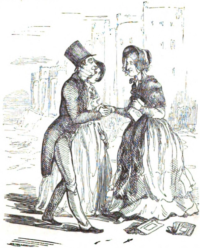 Mr. Pitt Crawley introduces Miss Briggs, his aunt’s companion, to Lady Jane Sheepshanks, his betrothed, with a smug look on his face. Miss Briggs, on her way home from the library, is holding one of her books and has dropped two others. Mr. Pitt is clasping her free hand in both of his, while Lady Jane is half hidden behind him, looking shy.