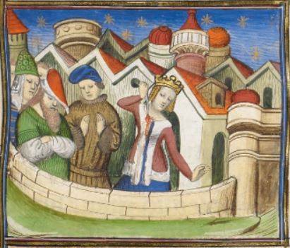 Dido (also called Elissa), the founder and queen of Carthage, is illustrated within the city walls in the centre of the image stabbing herself with a knife. After her husband, Acerbas, had been killed by her brother, she fled to Africa and founded Carthage and vowed to remain chaste in honour of her husband. When a foreign king asked for Dido’s hand in marriage and threatened to sack the city if she denied, she stabbed herself to protect her chastity. The city of Carthage is in the background of the image. There are three citizens standing beside Queen Dido.