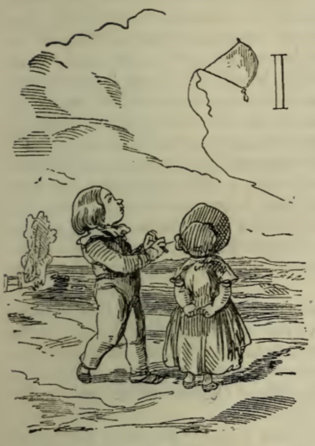 A pair of young children stand by the seaside. The girl is wearing a bonnet and has her fingers gripped behind her back, while the boy is holding onto the string of a kite. The kite is shaped like a cone with a rounded top, and flies next to the letter I.