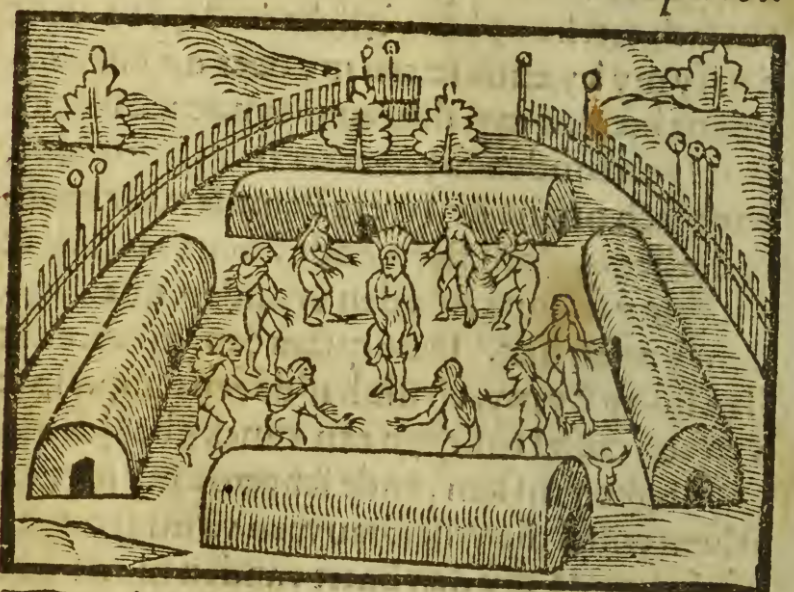 A Tupinambá village is shown, comprised of four long structures arranged in a circle and surrounded by a fence. Inside the village a group of women dance in a circle around a bearded man wearing a feathered headdress. Several of the women carry small children in slings on their backs. Several long poles with skulls mounted on the ends have been planted in the ground around the fence.