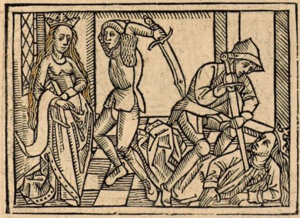 This engraving depicts a young servant girl getting stabbed in the chest with a sword by a man standing above her. This young servant girl is disguised to look exactly like Harmonia, the daughter of Gelon (brother to the king of Syracuse). Boccaccio explains that there was a rebellion in Syracuse against nobility, and before the murderers could get to Harmonia, her nurse disguised this young woman to look like Harmonia. The real Harmonia is depicted on the left side of the engraving. There is a man swinging a sword above his head which appears to be heading in Harmonia’s direction, however, Boccaccio explains that Harmonia hid from the murderers until they killed the look-alike servant.