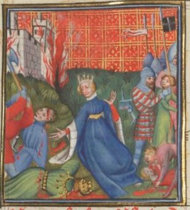 This illumination depicts Hecuba, the queen of Troy and wife of king Priam of Troy, in the centre of the image. Boccaccio explains that he wrote on Hecuba to highlight her terrible misfortunes. She had watched many of her children die, including the hero Hector, and watched her husband be disemboweled. Along with watching her loved ones violently die, she watched her entire city fall to the ground. Many believe she had become a slave to the Greeks once the city was taken. She is illustrated watching her loved ones die in this illustration. The city of Troy is burning in the background on the left side.