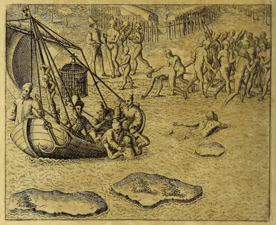 A group of French traders stand in a small boat near the coast while one of their group stands on the shore speaking with a group of Tupinambá men. The French appear to be trading for monkey, parrots, and possibly brazilwood, and they have a large bird cage on their boat. There is a Tupinambá village nearby and a group of people stand near the shore, some holding bows and arrows. A European man, captive of the Tupinambá, swims out to the French boat but is prevented from boarding so swims back to shore.