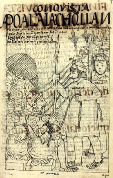 This chapter focuses on discussing the arrival of Spaniards and the Spanish conquest of Peru. This image depicts the capturing of the Spanish conquistador, Francisco Hernandez Giron. Giron was a traitor to the crown as he had declared a rebellion against the king of Spain. After Giron and his men fled a battle against the crown in Huatococha, a group of indigenous peoples found and captured them. Giron and his soldiers are illustrated sitting on the left side of the image with their hands bound with rope. Giron is identified by his name being written on his helmet. They were captured by the Wanca indigenous peoples, led by Apo Alanya Chuquillanqui and Waccra Waman. Chuquillanqui and Waman are identified by their names being written on their chests on the right side of the image. The caption at the bottom of the image reads, en Xauxa [in Jauja].