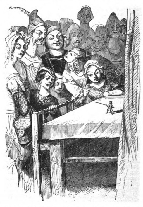 Here we see Gulliver performing for a crowd of Giants. The Farmer sold tickets to other giants to see Gulliver. On the front right, we see Glumdalclitch speaking to Gulliver and giving him instructions, while an older woman leans over her shoulder. Two other children stand in front of the table watching Gulliver. Behind the children are their parents. There are two more rows of giants in shadow. Gulliver stands on a table holding a piece of straw as though it was a fencing sword. The same image appears in both the 1839 and 1843 Krabbe editions.