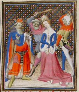 After threatening to make Nero lose his empire, Nero plotted his mother’s death. Agrippina knew he was up to something, but Nero continued planning. He finally had three men sent to kill Agripinna. They killed her by hitting her over the head and then stabbing her in the womb. This is represented in the image with one man, on the far left, looking at Agrippina, the man behind her with a bat raised to strike her, and the man on her other side also ready to strike her with a bat. She stands in the center, prepared for certain death.
