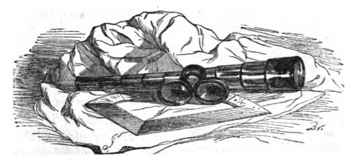 In this image we see Gulliver’s telescope and glasses lying on a tablet. All of which are lying on a sheet. The image comes at the end of the chapter. The same image appears in the 1839 Krabbe edition.