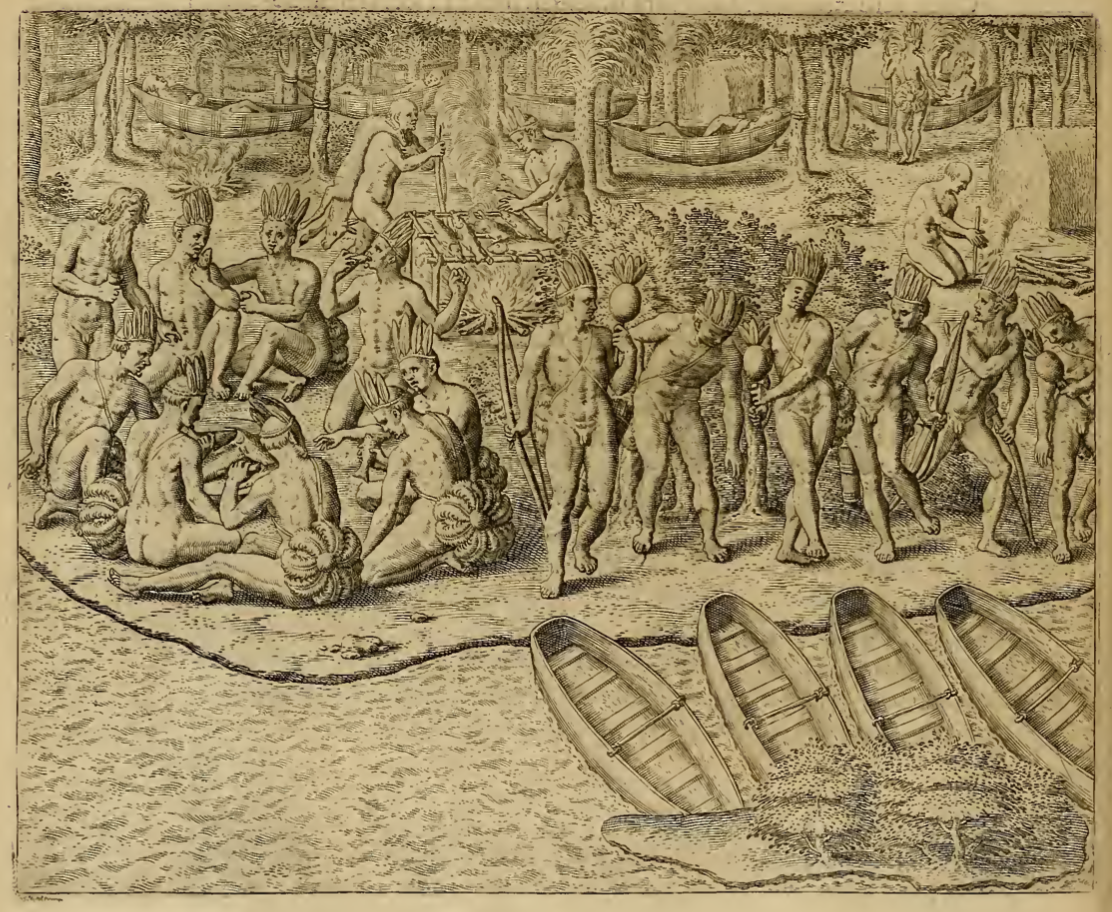 A group of Tupinambá men have set up a camp near the shore. Their four canoes have been pulled up along the shoreline, and the men sit and stand in relaxed groups. One man has been hunting and return to the group with a deer over their shoulder, and there are fish set on a wooden frame over a fire. In the background several hammocks have been hung between trees and are used for napping. Most of the men wear feathered headdresses and adornments around their waists and carry bows and arrow quivers. A bearded European man stands amongst the group to the left.